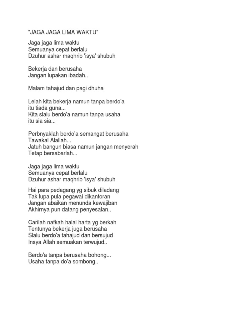 Lirik Lagu Jaga Sholat Lima Waktu M. Lagu jaga-jaga lima waktu. Unduh Lirik Lima Waktu dalam PDF Unduh MP3 Lagu Lima Waktu.